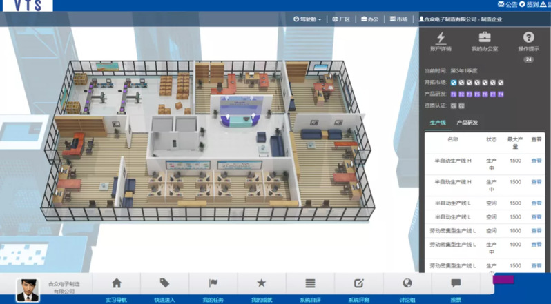 大赛以VTS跨专业虚拟仿真综合实训软件作为竞赛平台,以真实企业内、外部,上下游业务往来为载体,采用团队赛的的比赛形式,团队成员通过虚拟角色分别担任CEO、生产岗、市场岗、销售岗、财务岗、采购岗、物流岗、人力资源岗等岗位,分工合作在“VTS跨专业虚拟仿真综合实训平台”中完成商业数据分析、商业运营、商业模式设计、商业策略制定等任务。系统根据各团队的任务完成情况以企业所有者权益进行综合排名。
