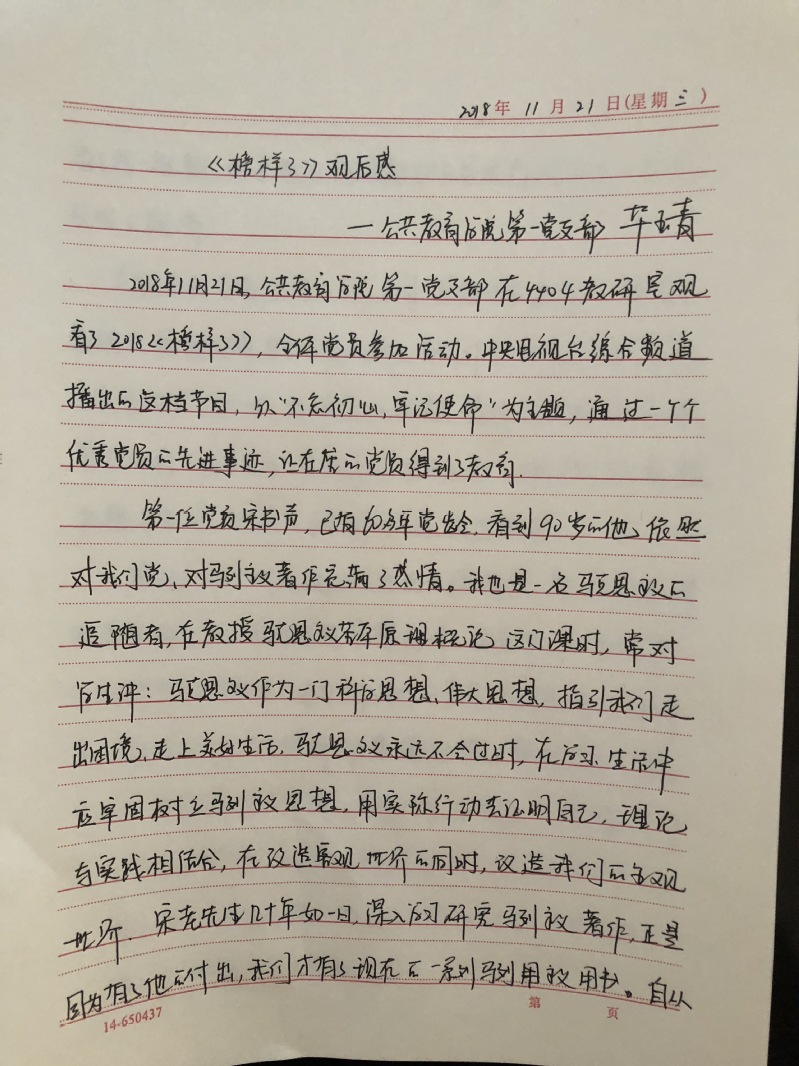 本次观看活动使教工党员们更加明白了党的使命与担当,更加理解了全心全意为人民服务的宗旨,更加加深了“不忘来路,永葆初心”的坚定政治信念。各位教师纷纷表示在今后的工作生活中,要发挥党员的模范带头作用,更好的完成教学及科研工作,全心全意为人民服务。