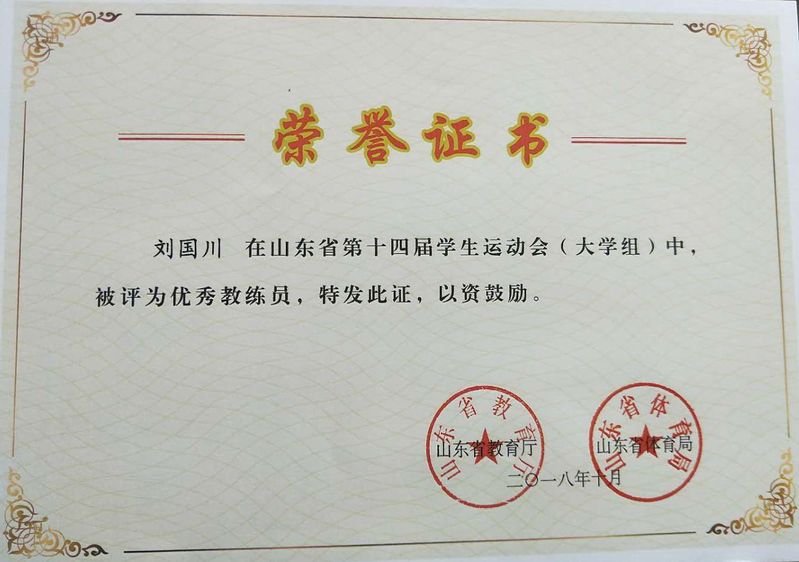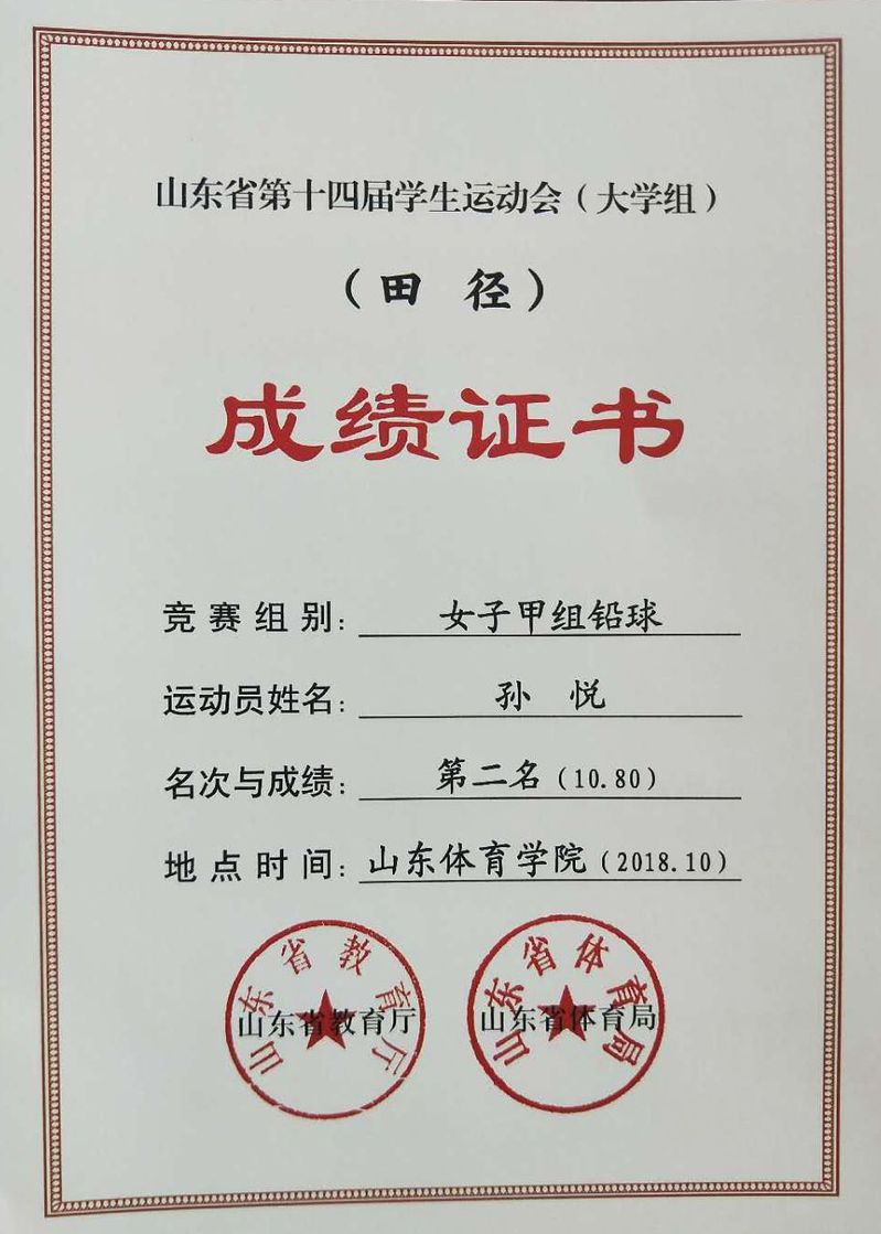 2018年山东省第十四届学生运动会田径比赛(大学生组)于10月28日结束全部比赛,在本届赛事中,我校财政金融系2017级金融管理二班孙悦同学获得优秀运动员称号,刘国川老师获得优秀教练员称号。
