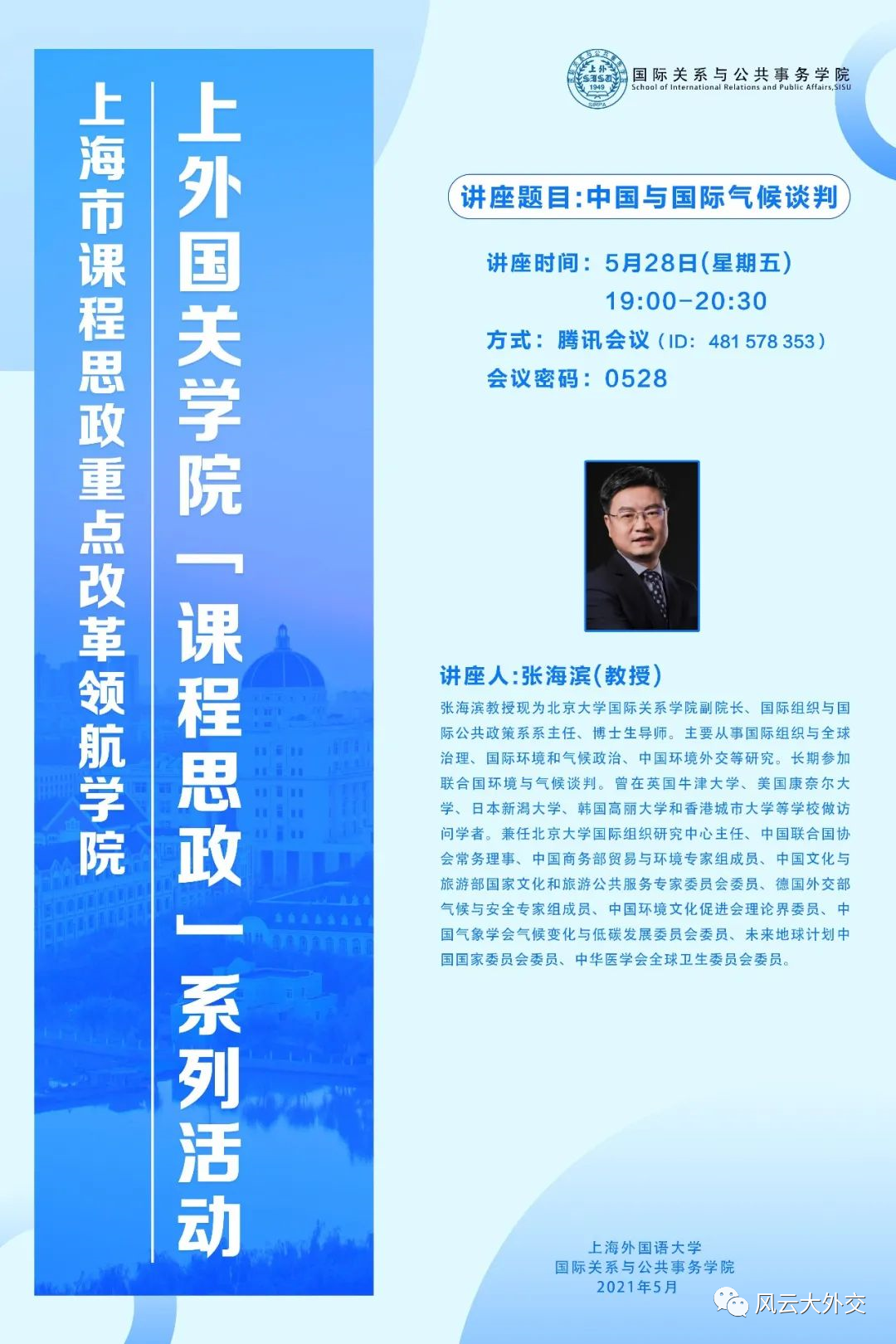 讲座人简介:张海滨教授,现为北京大学国际关系学院副院长、国际组织与国际公共政策系系主任、博士生导师。主要从事国际组织与全球治理、国际环境和气候政治、中国环境外交等研究。长期参加联合国环境与气候谈判。曾在英国牛津大学、美国康奈尔大学、日本新潟大学、韩国高丽大学和香港城市大学等学校做访问学者。兼任北京大学国际组织研究中心主任、中国联合国协会常务理事、中国商务部贸易与环境专家组成员、中国文化与旅游部国家文化和旅游公共服务专家委员会委员、德国外交部气候与安全专家组成员、中国环境文化促进会理论界委员、中国气象学会气候变化与低碳发展委员会委员、未来地球计划中国国家委员会委员、中华医学会全球卫生委员会委员。