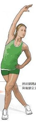 5、髂胫束伸展。拉伸部位:髂胫。双腿交叉,左腳跨过右腳,股部右顶,感到大腿紧绷。髂胫束是包裹大腿侧下方的带狀结蹄组织。伸展此处可以防止膝盖外侧疼痛(髂胫束综合症)。