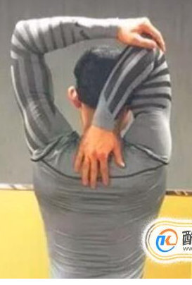 2、肱三头肌拉伸。站立,背、颈部伸直,也可以取坐位完成。右侧肩、肘关节微曲,尽力触摸右肩胛骨。上臂尽可能地靠近耳朵, 肱骨的后面指向前方,而不要翻向外侧。这样可以最大限度地拉长肱三头肌。可以用左手抓住右侧肘部,为右侧肱三头肌等长收缩提供阻力,保持颈部竖直,持续等长收缩6秒钟后,正常呼吸。等长收缩后,放松,深呼吸。呼气时,手触摸背部下方更远处,进一步拉长肱三头肌。