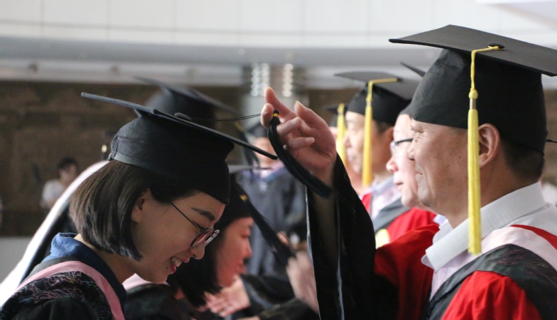 在毕业生向导师献花过后,仪式正式开始。随着校歌缓缓响起,出席仪式的导师为毕业生代表拨穗、颁发学位证书、握手祝福后进行合影留念。学士帽流苏从右边拨向左边的过程象征着毕业生从学生到学士的转变;代表着毕业生学有所成,能够展翅高飞,去创造属于自己灿烂辉煌的未来。