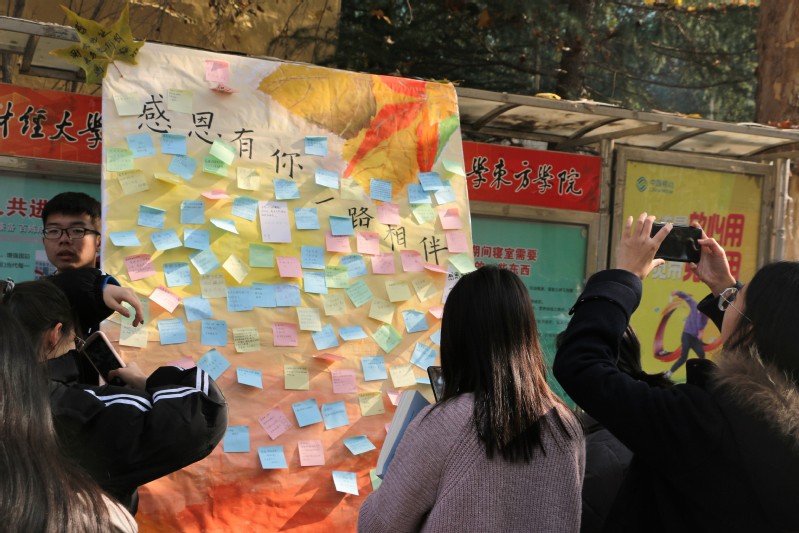 11月22日中午,校学生会心理健康服务部承办的“感恩有你,一路相伴”感恩节活动在餐厅门口温情开展,来自不同学院不同专业的同学怀带一颗感恩之心,在一张张便利贴上书写下他们的祝福,一块充满“心语”的感恩板,在这个寒冷的冬日缤纷呈现。
