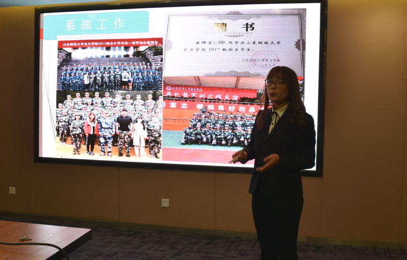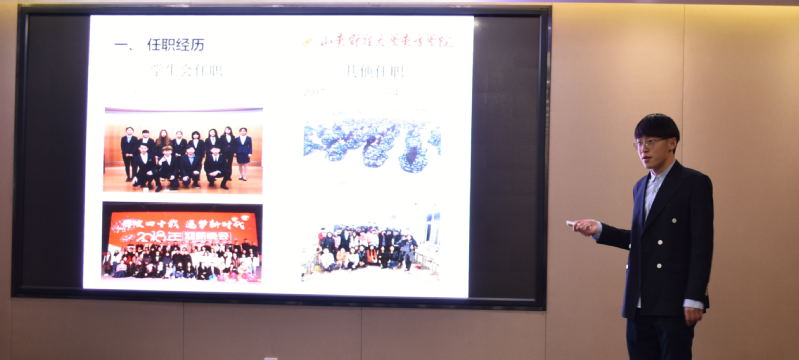 活动现场,竞选同学们将自己的学习、工作和生活情况呈现在幻灯片上,在简短的4分钟演讲过后,评委们进行现场打分。