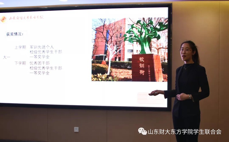 活动现场,竞选同学们将自己的学习、工作和生活情况呈现在幻灯片上,在简短的4分钟演讲过后,评委们进行现场打分。