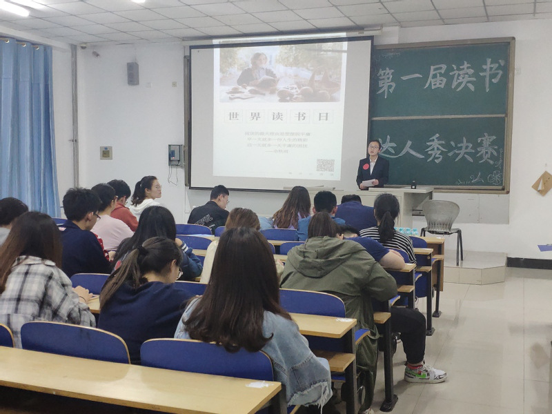 2.为纪念世界读书日,激发大学生对读书的兴趣,4月23日下午,由工商管理学院发起并承办第一届读书达人秀决赛在唯美楼5305教室举行。比赛以“我是读书达人”为主题进行演讲,并包括了情景剧、舞台剧、微电影等多种形式的与书本结合的创新展示。活动现场紧张刺激又充满乐趣,选手们个性化的现场发挥引来了同学们的阵阵欢笑与喝彩。此次比赛使同学们提升了阅读的兴趣,也使同学们更深层次地领悟到阅读的价值。