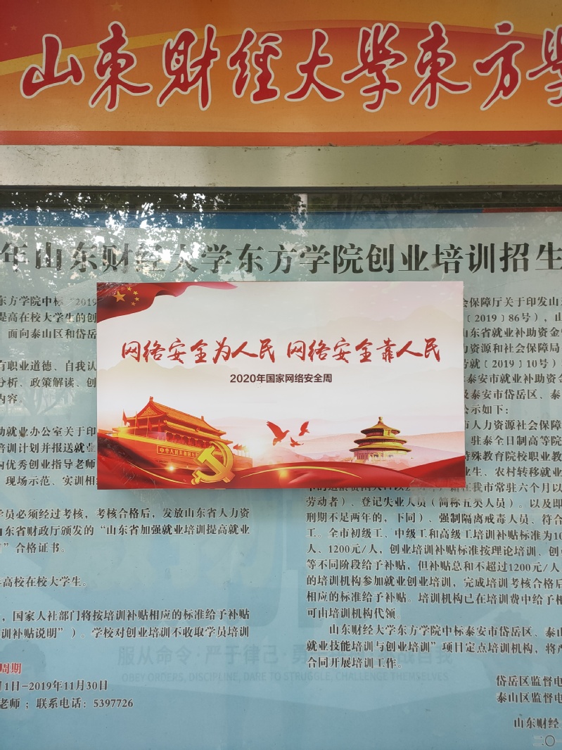 网络的迅速发展给大家的生活带来便利的同时,无数的网络诈骗案件和违法行为也随之出现。目前大学生对于网络安全认知还不全面,自我保护意识相对薄弱,常常受到网络上的不法侵害。按照《山东省教育厅关于做好2020年国家网络安全宣传周山东省校园日活动的通知》的通知要求,我校围绕主题活动制定了网络安全宣传周活动方案。本次活动采用线上线下两种宣传手段。