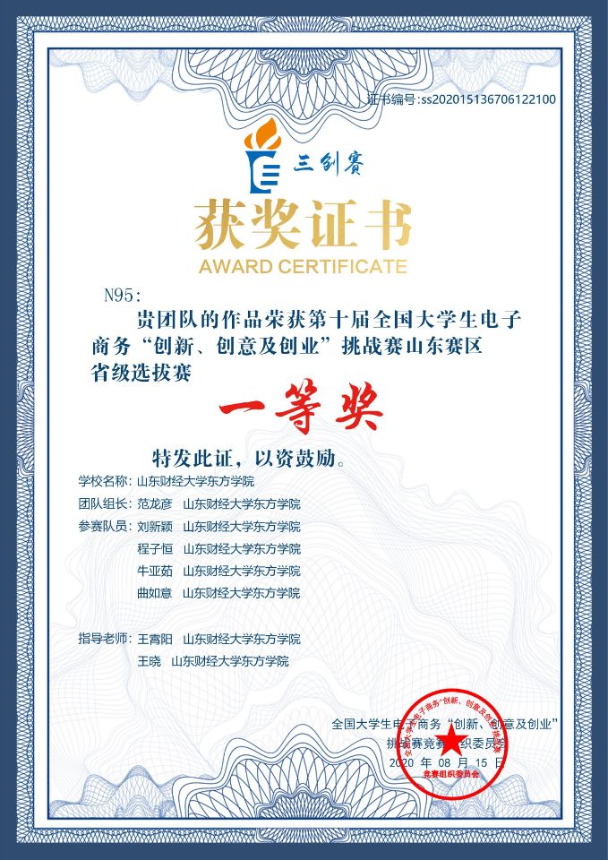本次商业精英挑战赛山东赛区共有47所院校,314支队伍参赛。数据科学学院师生高度重视本次竞赛,老师积极动员组织与指导学生参赛工作。疫情期间,老师通过网络的形式对参赛学生进行悉心指导,各组选手充分准备积极应对。最终,王晓和王霄阳老师指导的谢雪晴等学生团队的作品《动感悦文》和陶梦琪等同学团队的作品《防狼手环》荣获山东省二等奖,隋丽红和谢蕙老师指导的崔明涛等同学团队的作品《一体化智能淋浴舒干机》、王晓和王霄阳老师指导的栾晓菲等同学团队的作品《icar》荣获山东省三等奖,王晓、王霄阳、隋丽红和谢蕙老师获得优秀指导教师奖。