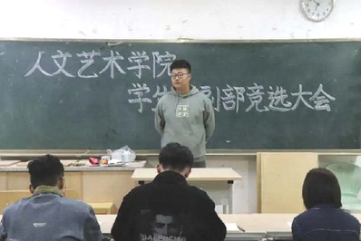 1.10月5日晚,人文艺术学院分别在4305,4309教室举行学生会副部竞选大会,院学生会主席团及各部部长参加会议。参与副部竞选的同学们依次上台演讲,用精干朴素的语言表达了自己对学生会工作的热爱。