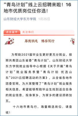 今年以来在大学生就业集中期,山东共青团推出了“青鸟计划 就选山东”2021大型云招聘活动,团省委通过立足山东、精准挖掘了一批适合大学生就业的岗位。我校积极响应上级活动安排,通过校就业网站、毕业班群、学校公众号等途径组织毕业生积极参与,活动开始至今及时通过本次云招聘活动发布了2万个以上的优质岗位信息、16万个用人需求信息,积极拓宽我校毕业生就业的渠道。