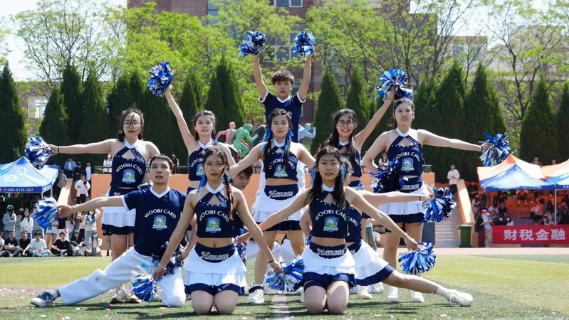 啦啦操表演中,他们身着色彩鲜明的服饰,笑容灿烂,精神抖擞,洋溢着青春的活力。他们舞姿铿锵,动作整齐多样,用高难度的造型征服了观众,赢得观众的一阵阵叫好!