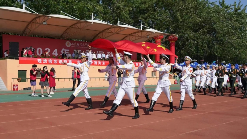 上午9点,在《运动员进行曲》的激昂旋律中,国旗护卫队庄严入场,校旗飘扬,校徽紧随。花束方阵,同学们手持五彩斑斓的鲜花,散发着青春的热情与活力。彩旗方阵高举着红色旗帜,燃烧着激情与力量。紧接着,各运动方阵、裁判员方阵,在铿锵有力的运动员进行曲中,依次走进场地。他们高亢嘹亮的口号,坚定勇毅的目光,展示必胜的勇气和力量,也展现了山财大东方学院师生积极向上、勇攀高峰的高远志向。