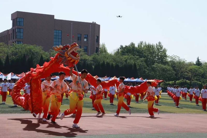 阳光洒落在操场,同学们手持彩龙舞出激情四溢的韵律。他们通过扭、挥、仰、跪、跳、摇等多种动作变化出各种造型。龙首上移下摆,龙身紧相跟随,龙尾矫健有力,龙腾盛世,祝福祖国,祝福学校兴旺发达。笑容如花绽放,那是青春最美的模样;一束束花球如碧波在荡漾,那是最靓的青春影像。绿草如茵,繁花似锦,她们用自己飞扬的青春跳出对时代的赞礼。