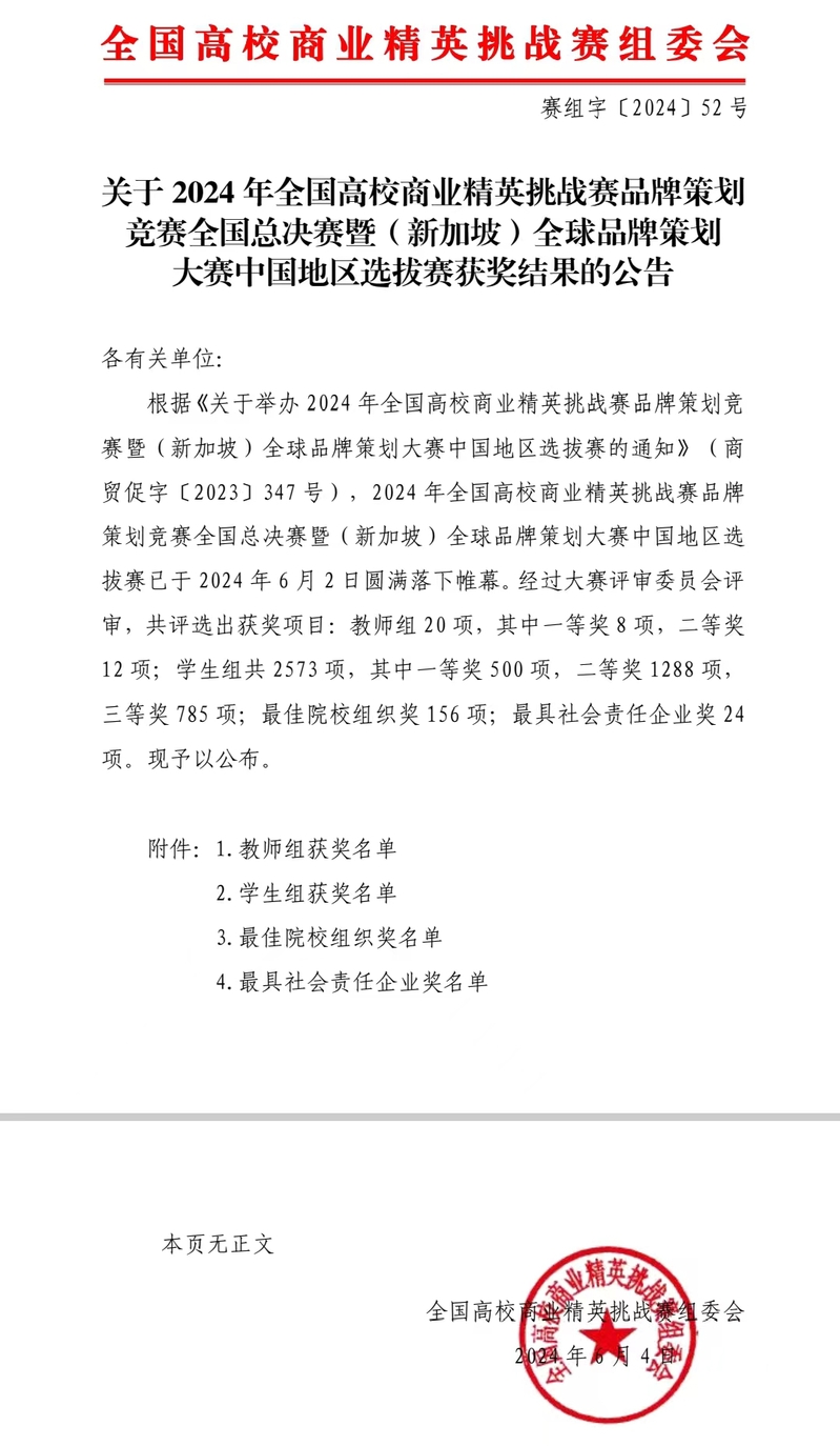 全国高校商业精英挑战赛品牌策划竞赛是《全国普通大高校学生竞赛分析报告》的入榜学科竞赛。该赛事由中国国际贸易促进委员会商业行业委员会承办,旨在培养高校学生的商业策划能力和实践创新精神。我校团队此前通过了理论知识赛、校赛、山东省总决赛的层层选拔,以山东省一等奖的成绩入围了全国总决赛。在全国总决赛中,该团队以品牌策划案陈述视频展示和线上实时答辩的方式,充分展示了方案的创新性、品牌定位的精准性以及品牌元素的独特设计,赢得了评审专家的高度评价。