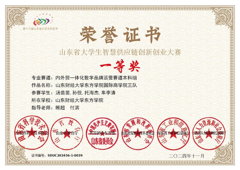 近日,由山东省教育厅、共青团山东省委、山东省科学技术协会、山东省发展和改革委员会等部门联合主办的第十六届山东省大学生科技节智慧供应链创新创业大赛落下帷幕。国际商学院选派7支代表队参加了内外贸一体化数字品牌运营和数智化供应链运营两个赛道的本科组比赛,最终荣获山东省总决赛一等奖2项、二等奖2项、山东省三等奖3项。顾超、李萍、吴国艳、甄程成、蒋茜茜、付滨等老师对比赛进行了全程指导。