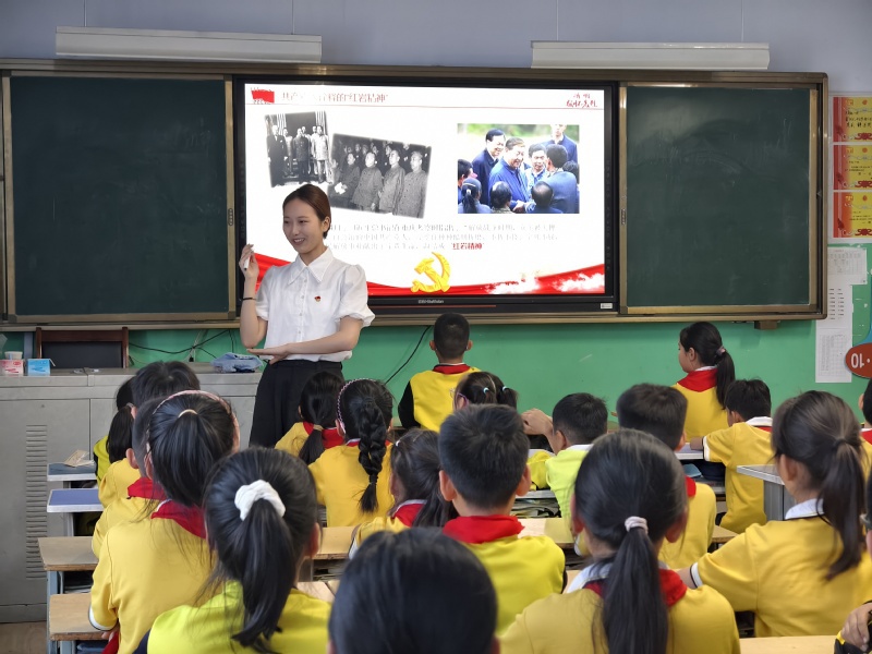 党员大姐姐通过监狱里的“小太阳”、拒绝糖果的“小英雄”、用树枝写出的“大学梦”和传递情报的“小海鸥”四个小故事,生动描绘了小萝卜头短暂而壮烈的一生,以及他在极端恶劣的环境中展现出的坚忍不拔和勤奋好学的精神。“牺牲时他才九岁,却用短暂生命交给我们三颗神奇的种子:第一颗叫‘勇敢’,像小萝卜头那样在黑暗里也能让心灵发光;第二颗叫‘珍惜’,今天的糖果和书包都是英雄用生命换来的礼物;第三颗叫‘传承’,让我们把坚定的信念种在心里,开出永不凋谢的爱国花!”伴随着《红梅赞》激昂的旋律,江姐的故事走进了孩子们的视野。江姐就像一株傲雪的寒梅,出生在苦难的旧社会,却绽放得像太阳一样闪亮。为守护地下党员的名单,任凭竹签钉进指尖,她说:“毒刑拷打那是太小的考验……竹签是竹做的,但共产党员的意志是钢铁!”这句故事深深震撼着孩子们。
