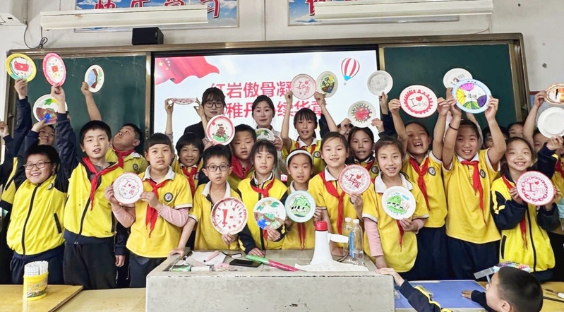 “今天呀,咱们要来一场有趣又特别的创作!那就是用蛋糕纸盘来画出我们心中的红岩精神。”小朋友们紧握手中的蛋糕纸盘,迫不及待的要开始自己地创作。他们手握画笔,有的把黑板上的小萝卜头用简笔画的形式刻画下来,有的在盘子的正中央画出了一幅大大的国旗图案。“姐姐,你看看我画的这个小萝卜头!”“老师,我画的国旗很红,是英烈们鲜血的颜色!”