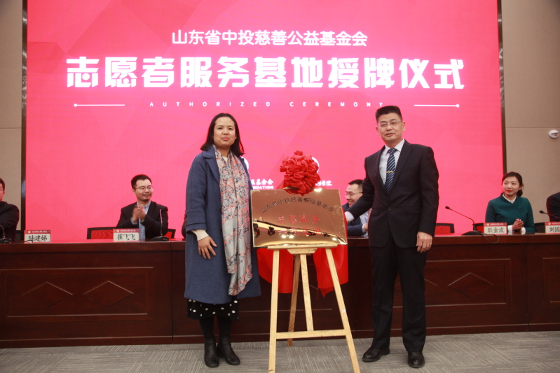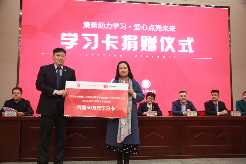 中投慈善与我校深度合作,建立“山东省中投慈善公益基金会志愿者服务示范基地”。仪式上,陆建娣与耿金波共同为基地揭牌;陆建娣代表基金会为我校学生捐赠了价值50万的学习卡,教务处处长宋凯明代表我校接受捐赠。