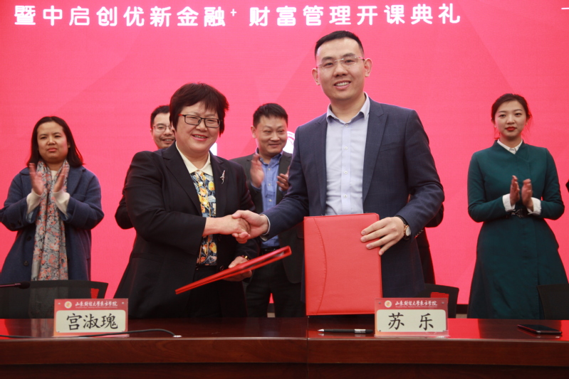 在轻松欢快的乐曲声中,宫淑瑰与苏乐签署“新金融+财富管理”产教融合项目合作协议。