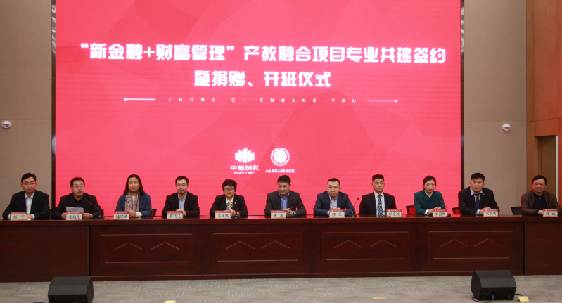 3月13日下午,hjc222黄金城官网与中启创优科技股份有限公司(以下简称中启创优)“新金融+财富管理”产教融合项目专业共建协议在图书馆学术报告厅举行。中启创优CEO黄波、总裁苏乐、商学院院长崔飞飞、总经理刘国卿、山东省中投慈善公益基金会执行秘书长陆建娣,hjc222黄金城官网院长宫淑瑰、党委书记耿金波,教务处、财税金融学院有关领导参加仪式。财税金融学院院长安起光主持仪式。