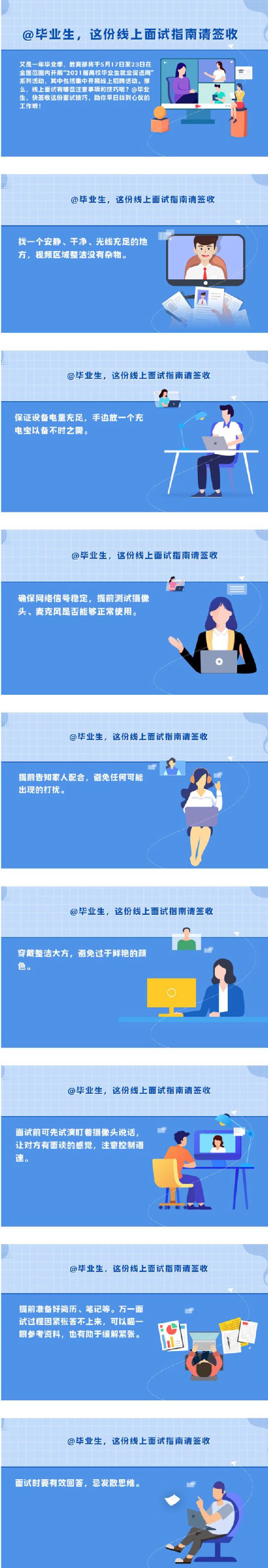 又是一年毕业季,教育部将于5月17日至23日在全国范围内开展“2021届高校毕业生就业促进周”系列活动,其中包括集中开展线上招聘活动。那么,线上面试有哪些注意事项和技巧呢?@毕业生,快签收这份面试技巧,助你早日找到心仪的工作哦!