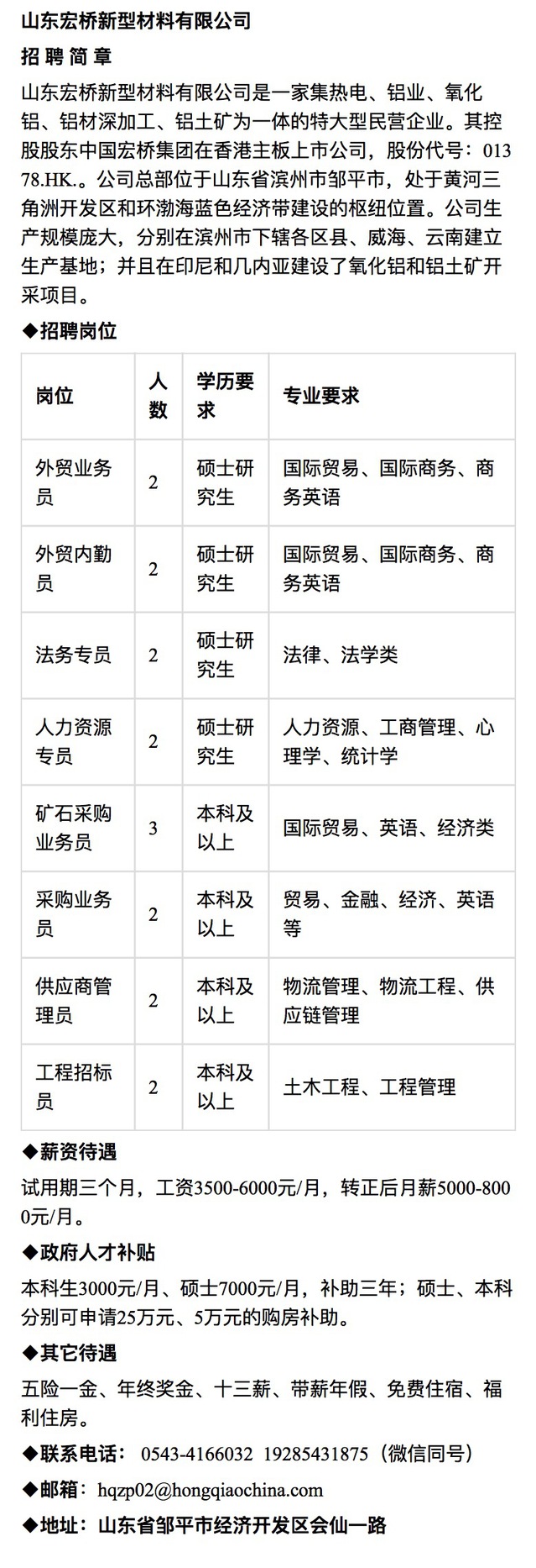 招聘 山东宏桥新型材料有限公司职能类岗位招聘