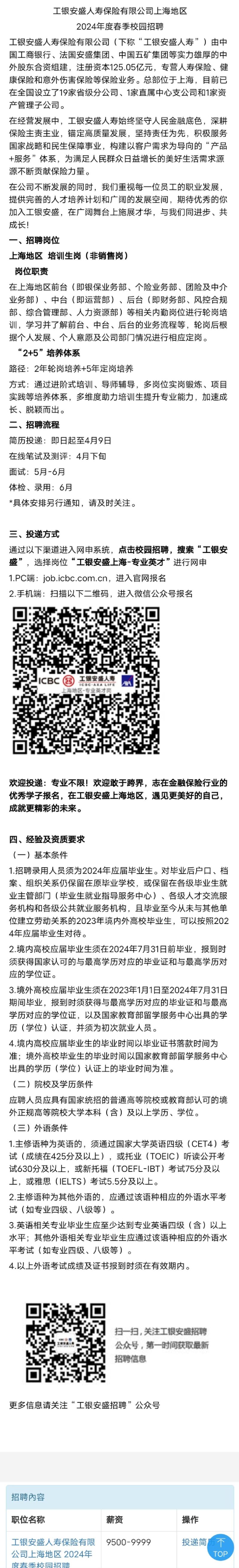 招聘|工银安盛人寿保险有限公司上海地区 2024年度春季校园招聘