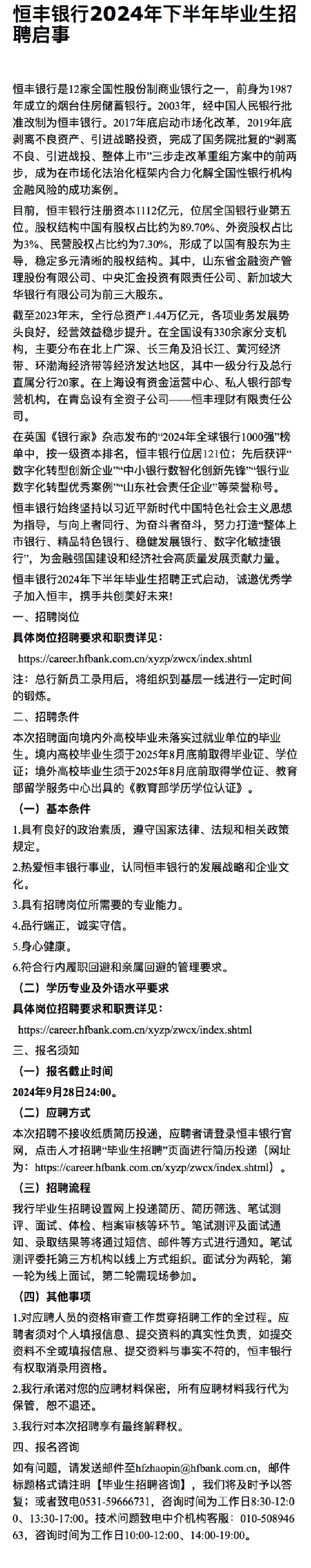 招聘 恒丰银行2024年下半年毕业生招聘启事