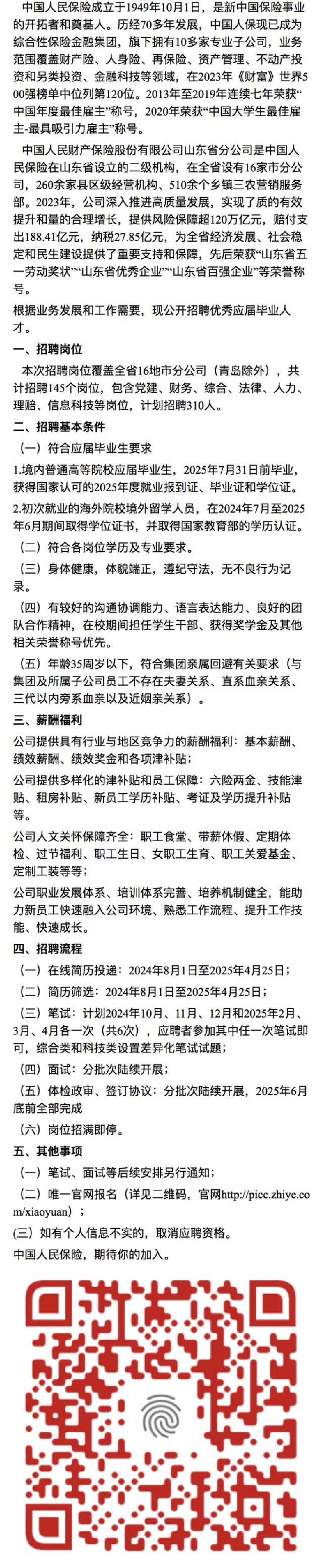 招聘 中国人民财产保险股份有限公司山东省分公司2025年校园招聘