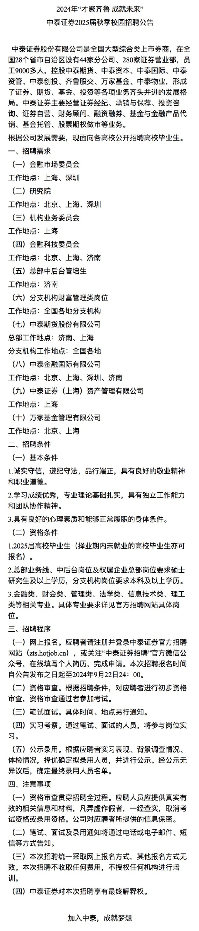 招聘 中泰证券股份有限公司2024年秋季校园招聘