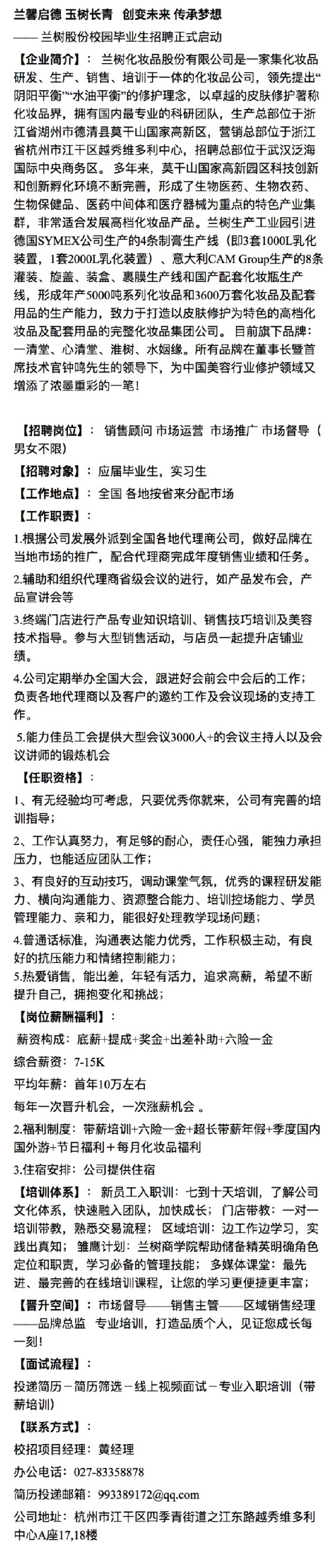 招聘 兰树化妆品股份有限公司