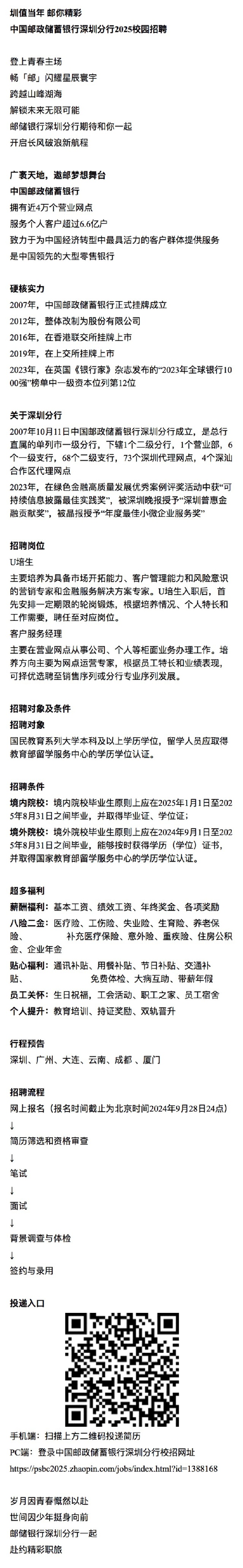 招聘 中国邮政储蓄银行深圳分行2025校园招聘
