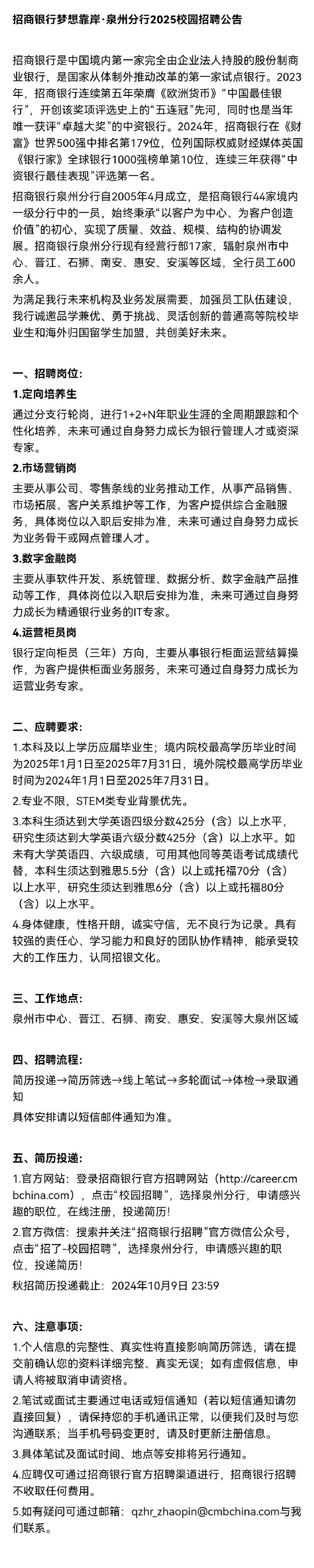 招聘信息 招商银行梦想靠岸 泉州分行2025校园招聘简章