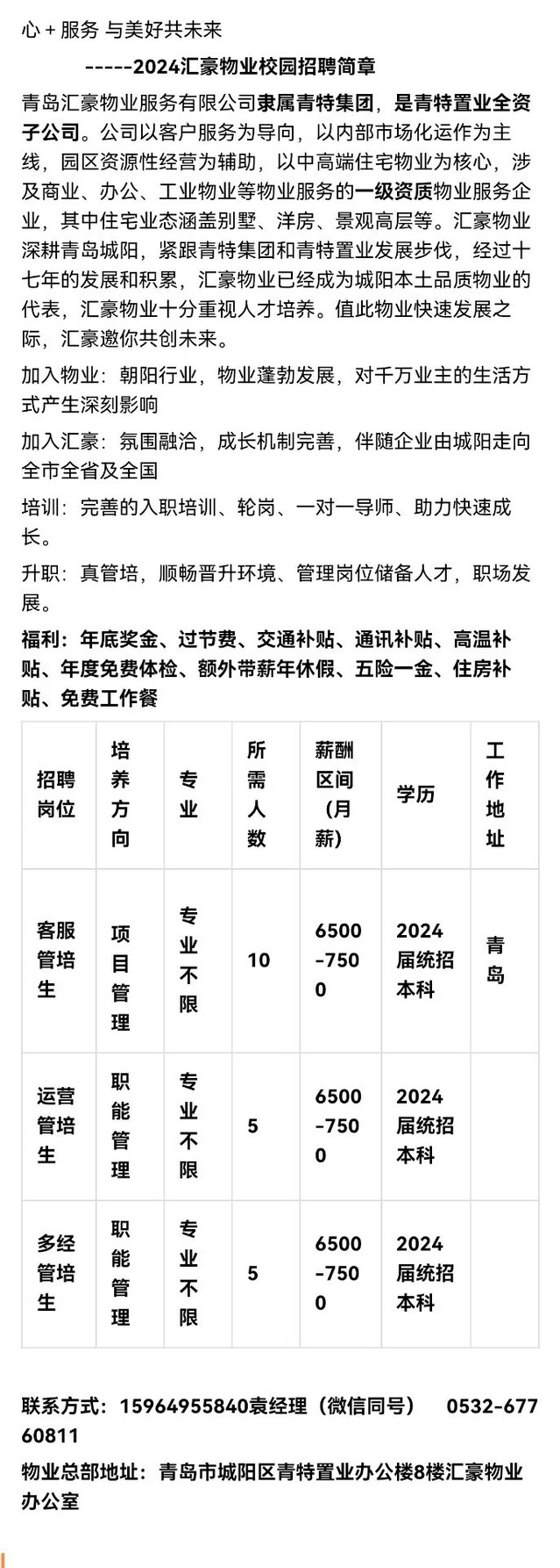 招聘 青岛汇豪物业服务有限公司2025届校园招聘