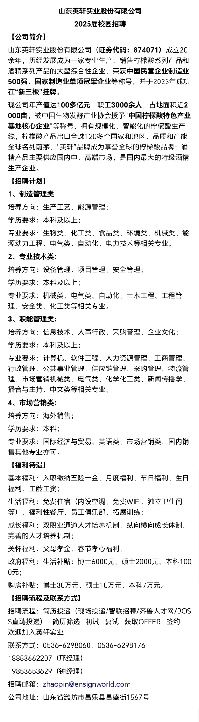 招聘 山东英轩实业股份有限公司招聘公告