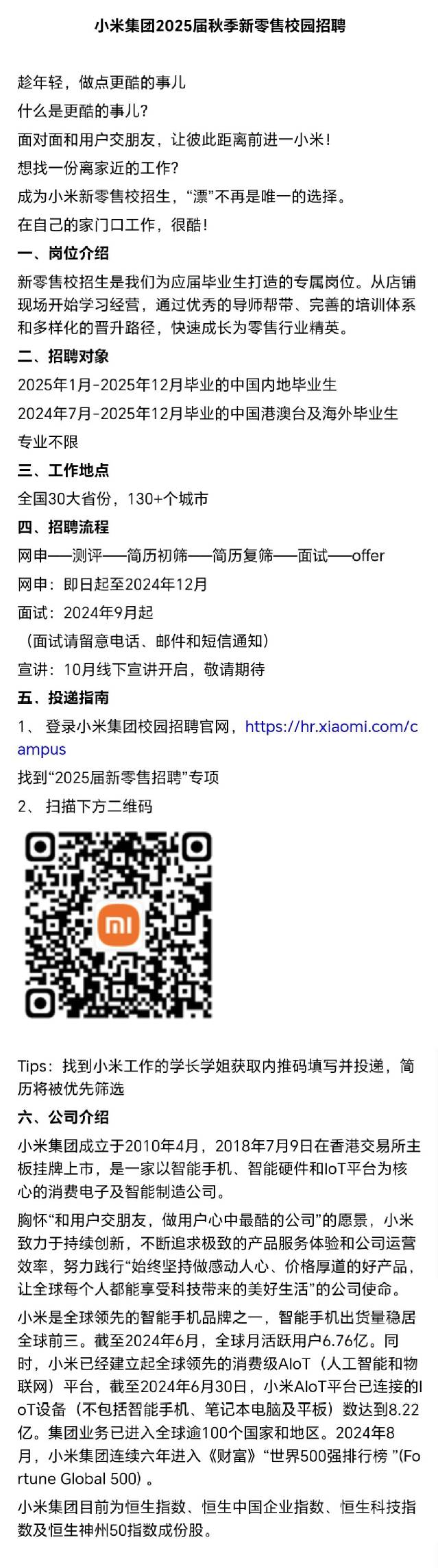 招聘 小米集团2025届秋季新零售校园招聘