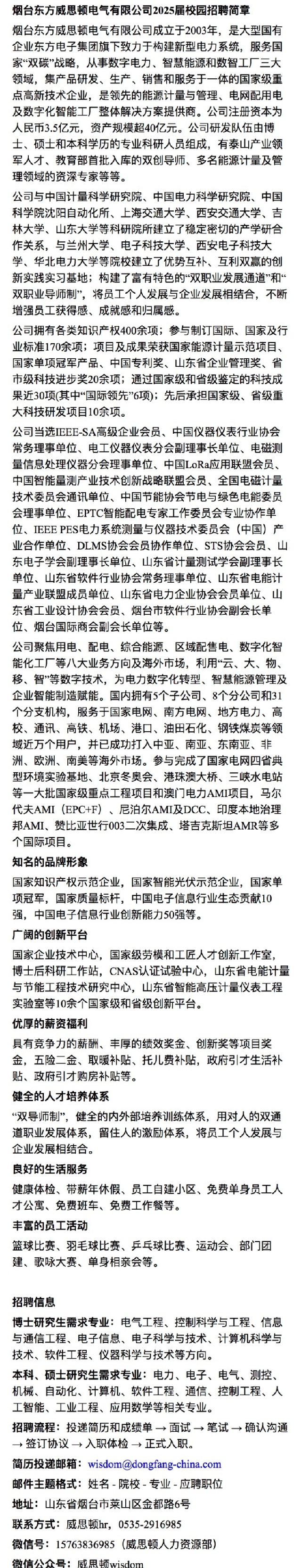 招聘 烟台东方威思顿电气有限公司2025届校园招聘简章