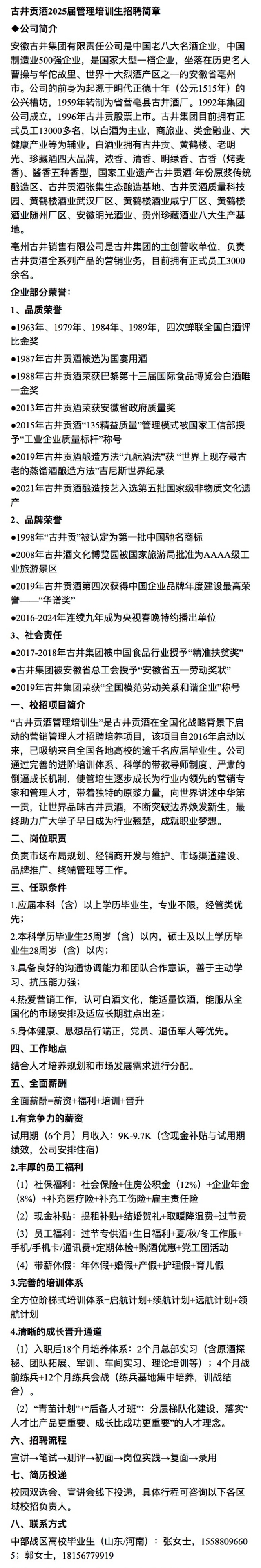 招聘 古井贡酒2025届管理培训生