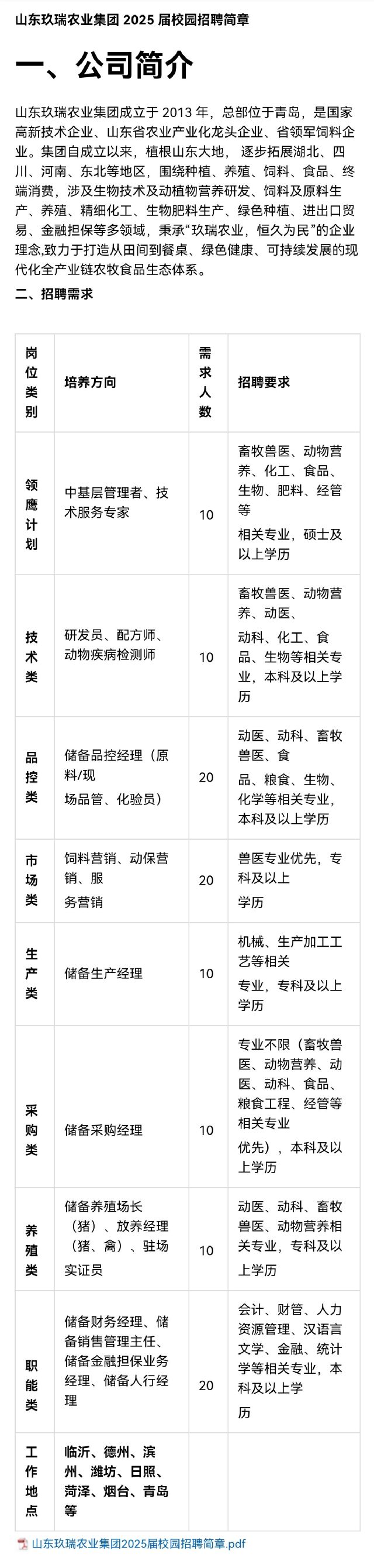 招聘 山东玖瑞农业集团2025届校园招聘简章
