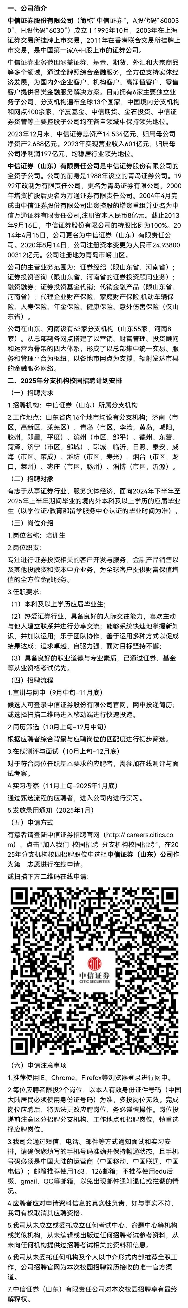 招聘 中信证券(山东)有限责任公司2025年校园招聘简章