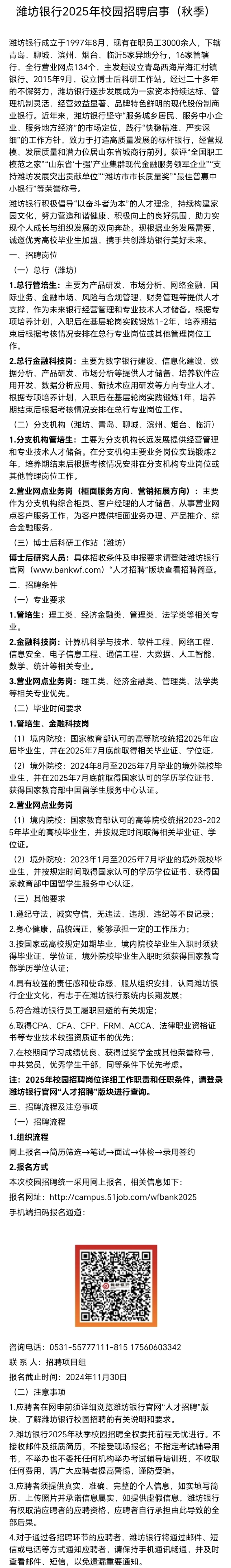 招聘 潍坊银行股份有限公司