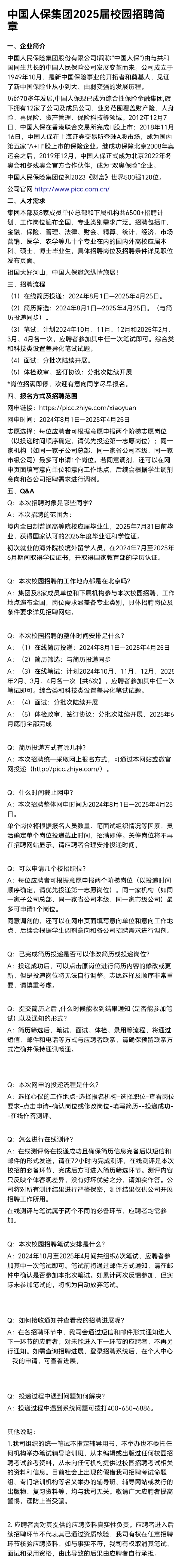 招聘 中国人保集团2025届校园招聘简章