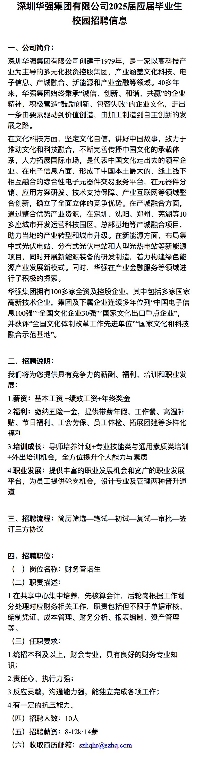 招聘 深圳华强集团有限公司2025届应届毕业生校园招聘信息