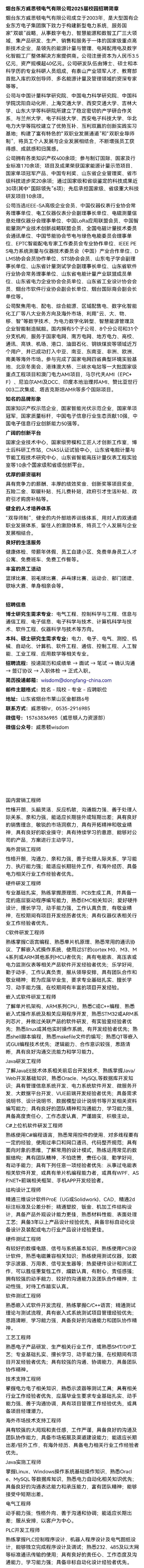 招聘 烟台东方威思顿电气有限公司2025届校园招聘简章