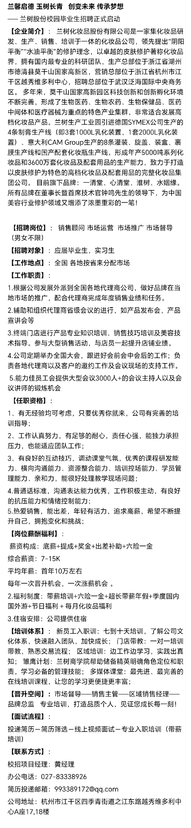招聘 兰树化妆品股份有限公司