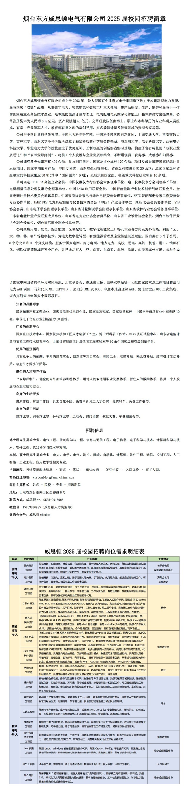 招聘 烟台东方威思顿电气有限公司2025届校园招聘简章
