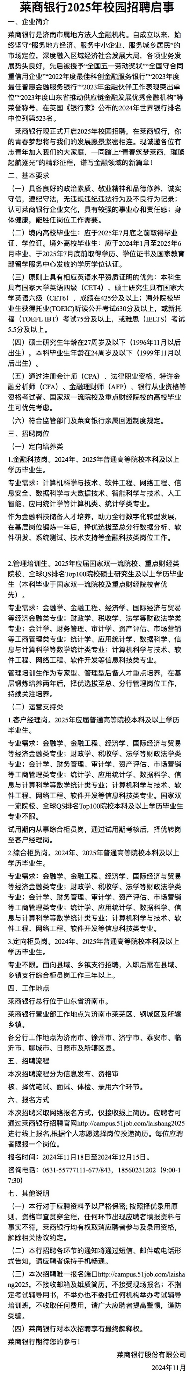 招聘 莱商银行2025年校园招聘启事