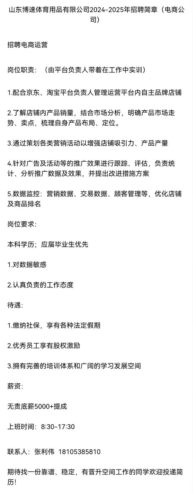 招聘 山东博速体育用品有限公司2024-2025年招聘简章(电商公司)