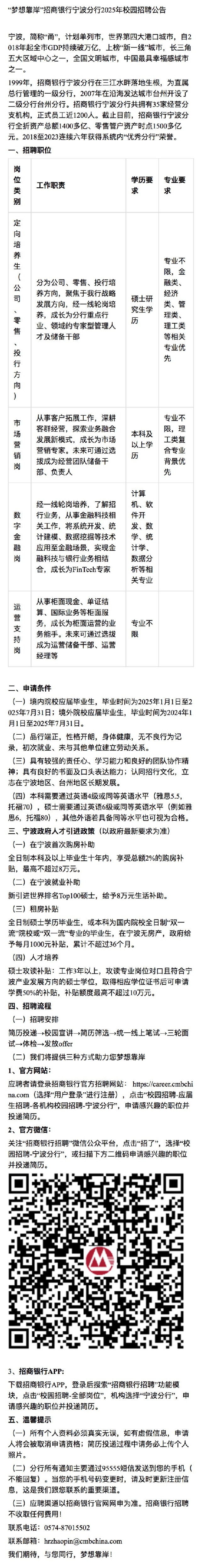 招聘 “梦想靠岸”招商银行宁波分行2025年校园招聘公告